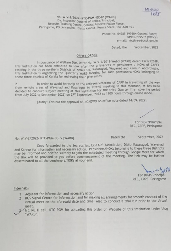 This Institution will organize the 3rd Quarter WARB meeting on 27th September 2022. In order to avoid hardship to the retirees/veterans of CAPF in traveling to attend the meeting in this Monsoon, it has been decided to conduct the subject meeting at this Institution for the 3rd quarter (i.e. covering the period from July 2022 to September 2022) on 27th September 2022 at 1100 hours through "Online mode".