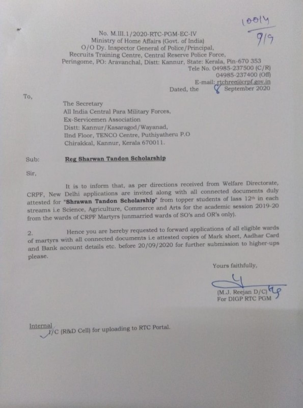 It is to inform that, as per directions received from Welfare Dte., CRPF, New Delhi applications are invited along with all connected documents dulay attested for the SHARWAN TANDON SCHOLARSHIP from topper students of class 12th in each stream for the academic session 2019-20 from the wards of CRPF Martyrs ( unmarried wards of SOs and ORs only). Hence you are requested to forward applications of all eligible wards of martyrs with all connected documents i.e Aadhar Card, attested copy of mark sheet, Bank account details before 20/09/20 for furter submission to higher ups.