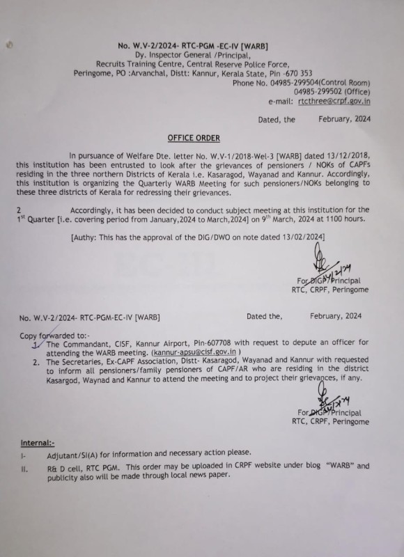 Quarterly WARB Meeting for pensioners/NOKs belonging to Kasaragod, Wayanad, and Kannur District of Kerala for redressing their grievances. The meeting will be conducted on 09/03/2024.